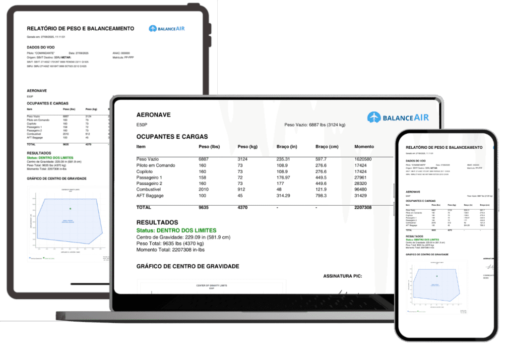 O BalanceAir utiliza os dados oficiais de cada aeronave (POH/AFM) para calcular peso, combustível, bagagem e centros de gravidade. Assim você voa seguro, dentro dos limites da aeronave.